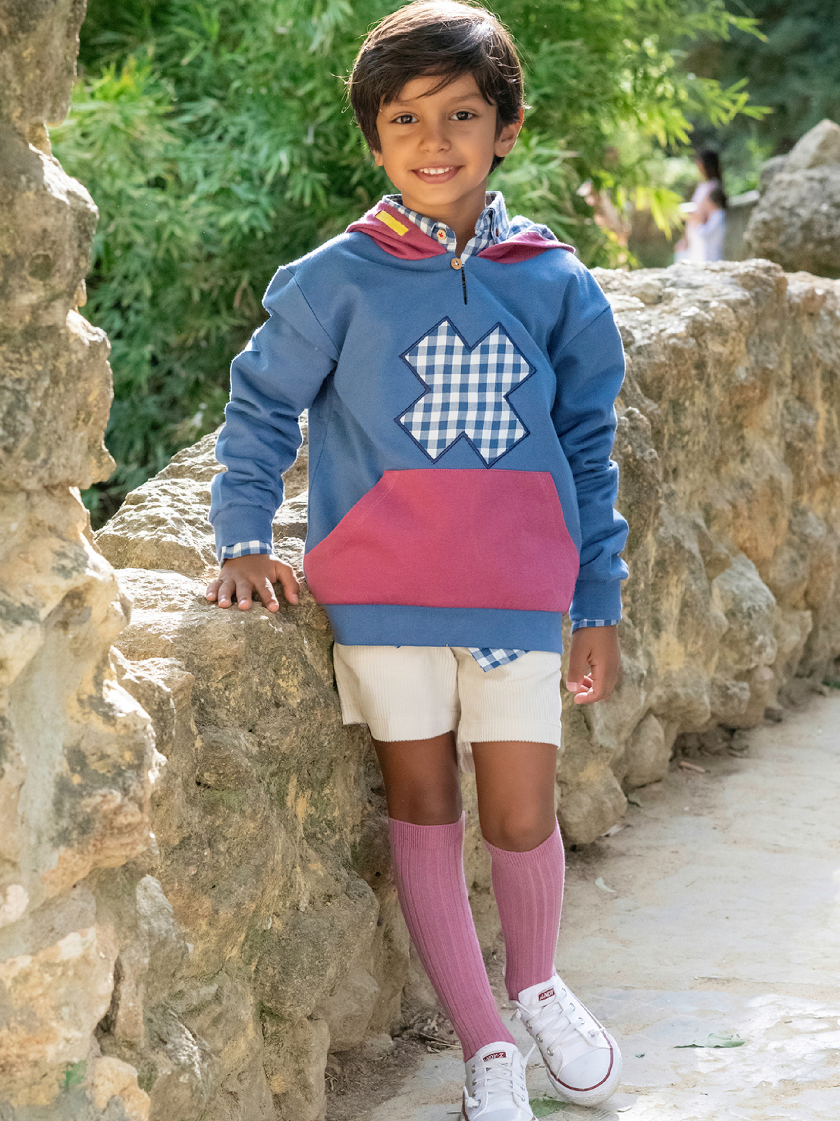 Sudadera unisex en color azul índigo confeccionadas en tejidos de alta calidad en 100% algodón y combinada con un color cereza en bolsillos canguros y capucha. Consta de combinación en tejido cuadros vichy en color azul tanto en capucha como en bordado .
